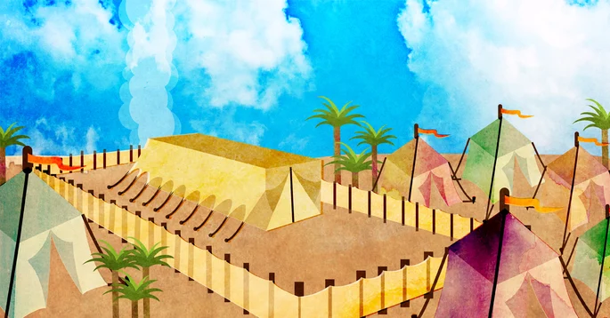 The Sanctuary’s three walls were fitted together from 48 upright wooden boards, each of which was overlaid with gold and held up by a pair of silver foundation sockets. The roof was formed of three layers of coverings. Across the front of the Mishkan was an embroidered screen held up by five posts.